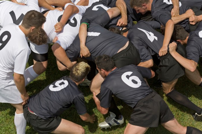 フォワードの8人は、スクラムを組む。スクラムは攻撃側を前方として「3人・4人・1人」の形で組まれる。それぞれのポジションが専門職だ。