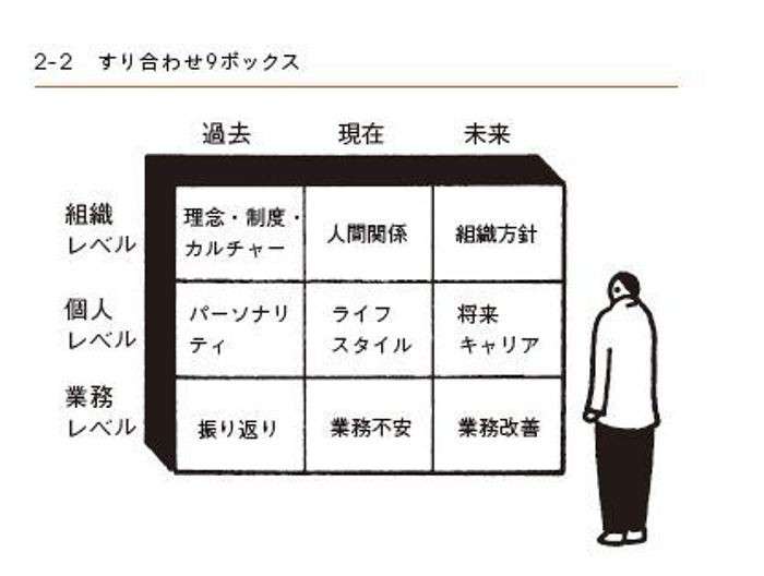 本書では、対話のテーマを明確にするために、「業務」「個人」「組織」それぞれを時間軸で3分割した、「すり合わせ9ボックス」を利用する。横軸が現在、過去、未来の時間軸、縦軸が業務、組織、個人の3つのレベルを表す3×3の9つのボックスを想像していただきたい。それぞれのテーマが人の頭の中の箱に詰まっていて、該当テーマについて対話をしながら、その箱を開けて中身を探っていくようなイメージだ。