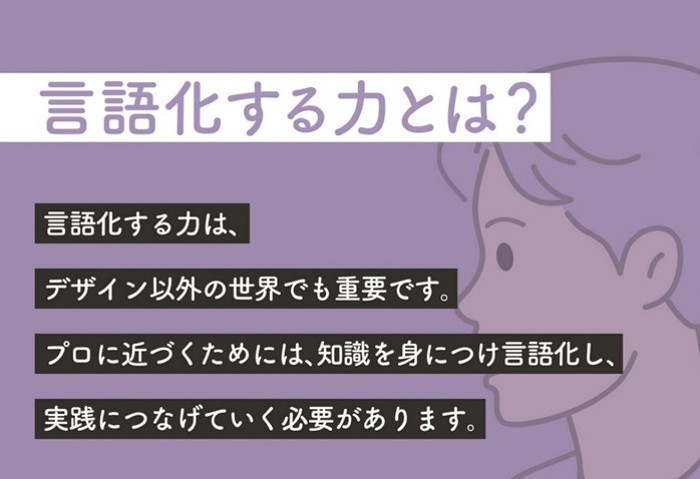 つまりデザインのプロを目指すのであれば、自分が見るものを、自分の言葉で明確に説明し、相手を納得させなければならない。そのためには、知識を身につけて「言語化」することが必須である。デザインの実践の場において、言語化こそがクライアントとコミュニケーションを図る方法だからだ。