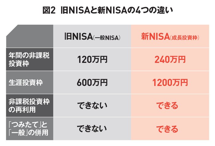 まずは、年間で240万円の非課税投資枠を利用できることだ。旧制度では120万円だったため、年間の限度額が2倍に引き上げられたことになる。