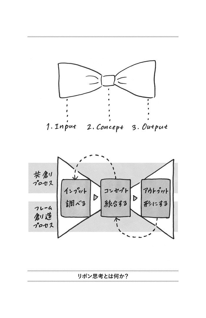 その基本フレーム、考え方のプロセスが「リボン思考」だ。「インプット」「コンセプト」「アウトプット」の3つのステップからなる。真ん中に結び目のあるリボンをイメージしよう。情報収集して事実について考える「インプット」に始まり、それを統合して解釈について考える「コンセプト」の段階できゅっとまとめ、広げて具体化することで解決策について考える「アウトプット」へと移る。