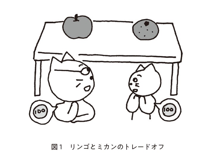 これは、「限られたお金で欲しいものを手にするにはどうすればいいか」という「資源制約」の問題である。「あちら(リンゴ)を手に入れたら、こちら(ミカン)が手に入らない」という状況を「トレードオフ」と呼ぶ。