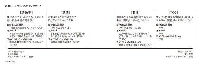 「あの人にだけは負けたくない」と「あの人に出会えて本当に良かった」。この相反する感情が、ひとりの人に抱く感情として同居することがある。実際、著者が実施した調査の結果からは、多くの人が誰かひとりのことを「ライバルであり、友でもある」と認識していることが見て取れる。本書ではこのような存在を「好敵手型ライバル」と呼ぶ。